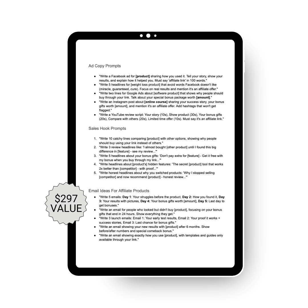 BONUS #5: AI Copywriting Command Center ($297 value) 25 ChatGPT prompts for creating high-converting ads, emails, and sales copy.